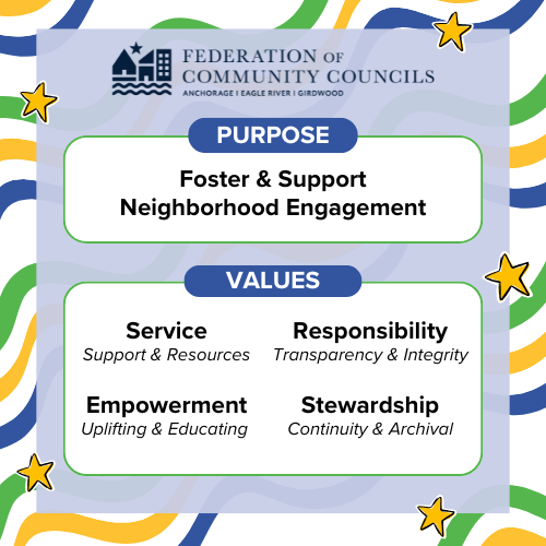 Federation of Community Councils, Inc. is a non-profit organization whose Board is made up of the representatives of each of Anchorage’s Community Councils.